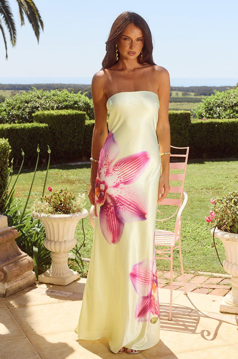 Our Celeste Maxi Dress is the picture of elegance, in an ethereal yellow hue with orchid placement prints, it’s the perfect piece for a wedding.