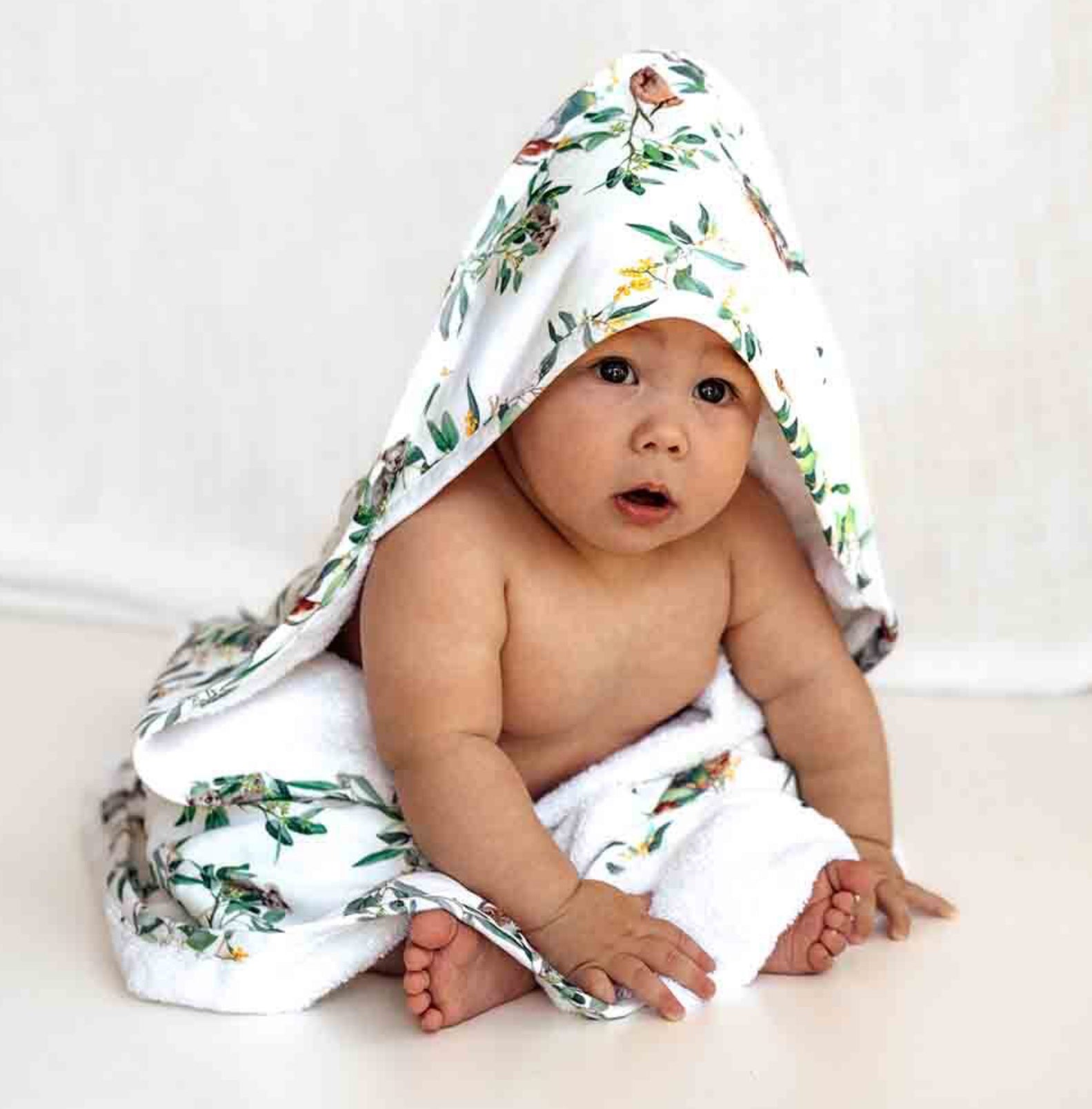 We have designed these unique towels with jersey organic cotton on one side and organic terry towelling on the other side. The jersey side features our exclusive Snuggle Hunny Eucalypt print. The towel is an extra large 90cm x 90cm so ideal for babies through to toddlers.