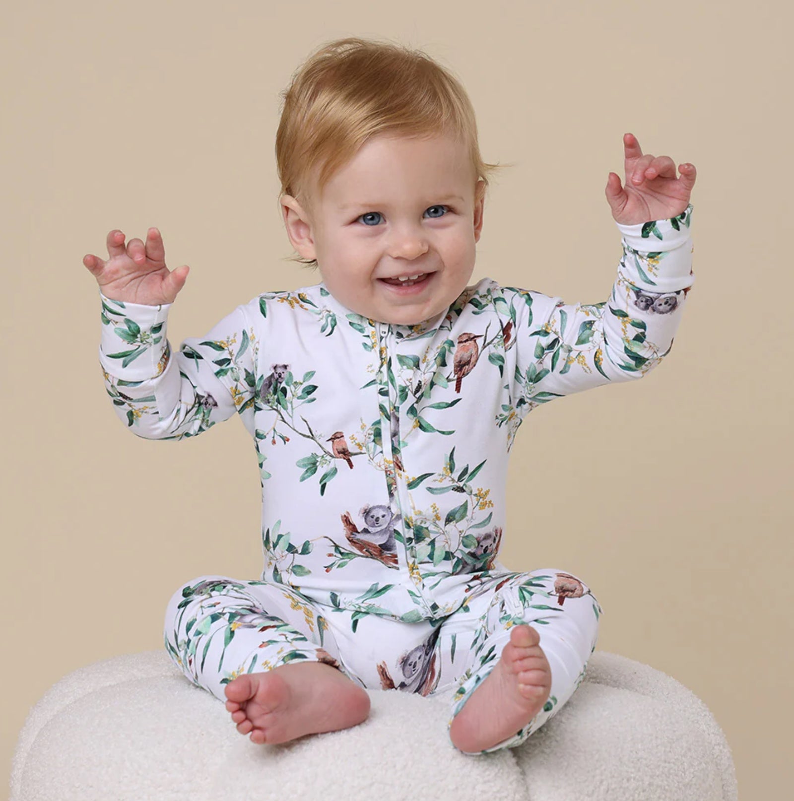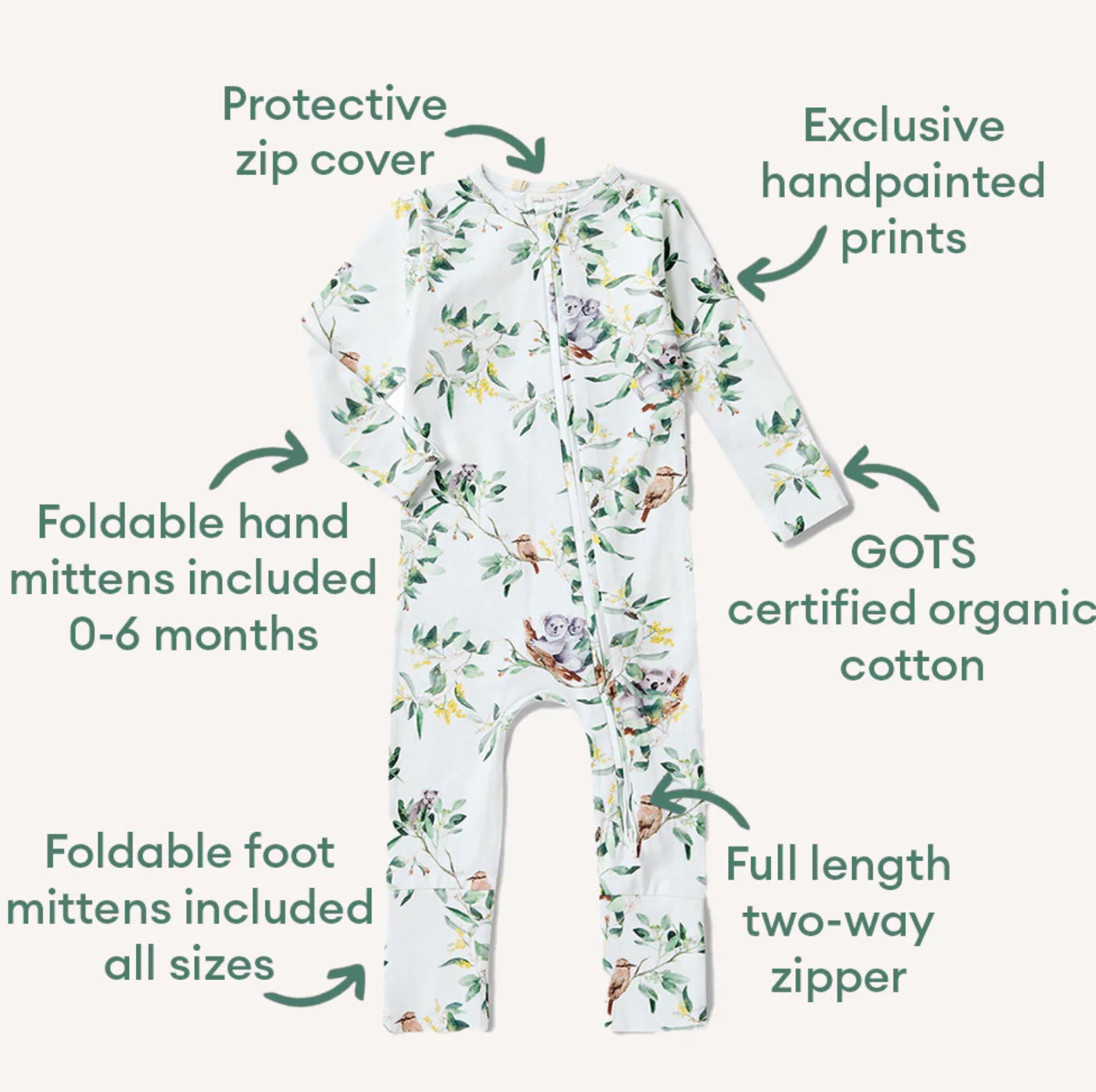 This design includes a two way zip, making it easy to get bub in and out for naptime and nappy change. Foldable hand mittens are included for newborn to 6 months and help stop little nails from scratching and also keep hands warm when the weather is cool. Bub can wear the mittens open or closed. For sizes from 6 months upwards, the mittens are replaced with a stylish cuff. Foot mittens are also an important feature and these are included on all sizes. Who doesn’t love to tuck in those little feet for bedtime to keep warm?