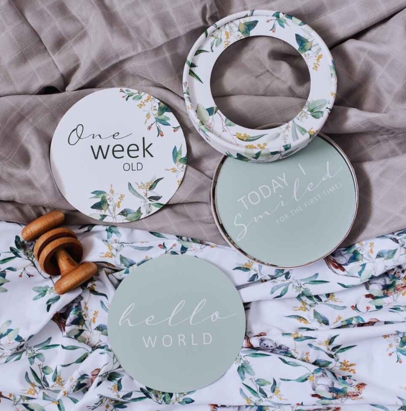 This 2 in 1 pack contains 25 Reversible milestone cards that coordinate well with our organic wraps and clothing.