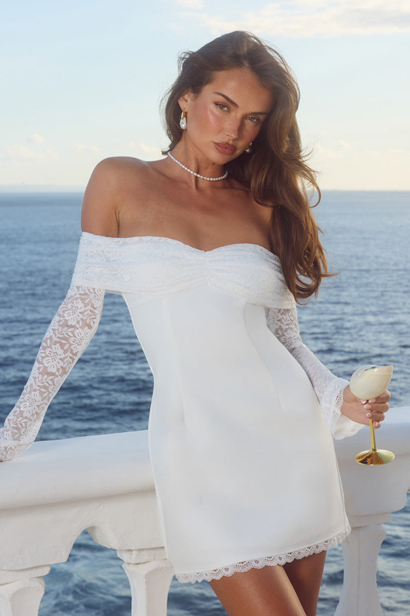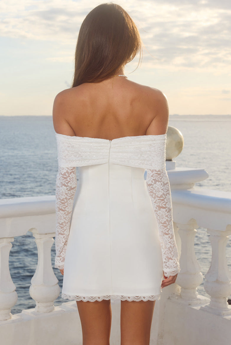 Our Leona Mini Dress is the perfect feminine bridal piece, featuring a delicate lace contrast with micro sequins and ruching for a soft look.