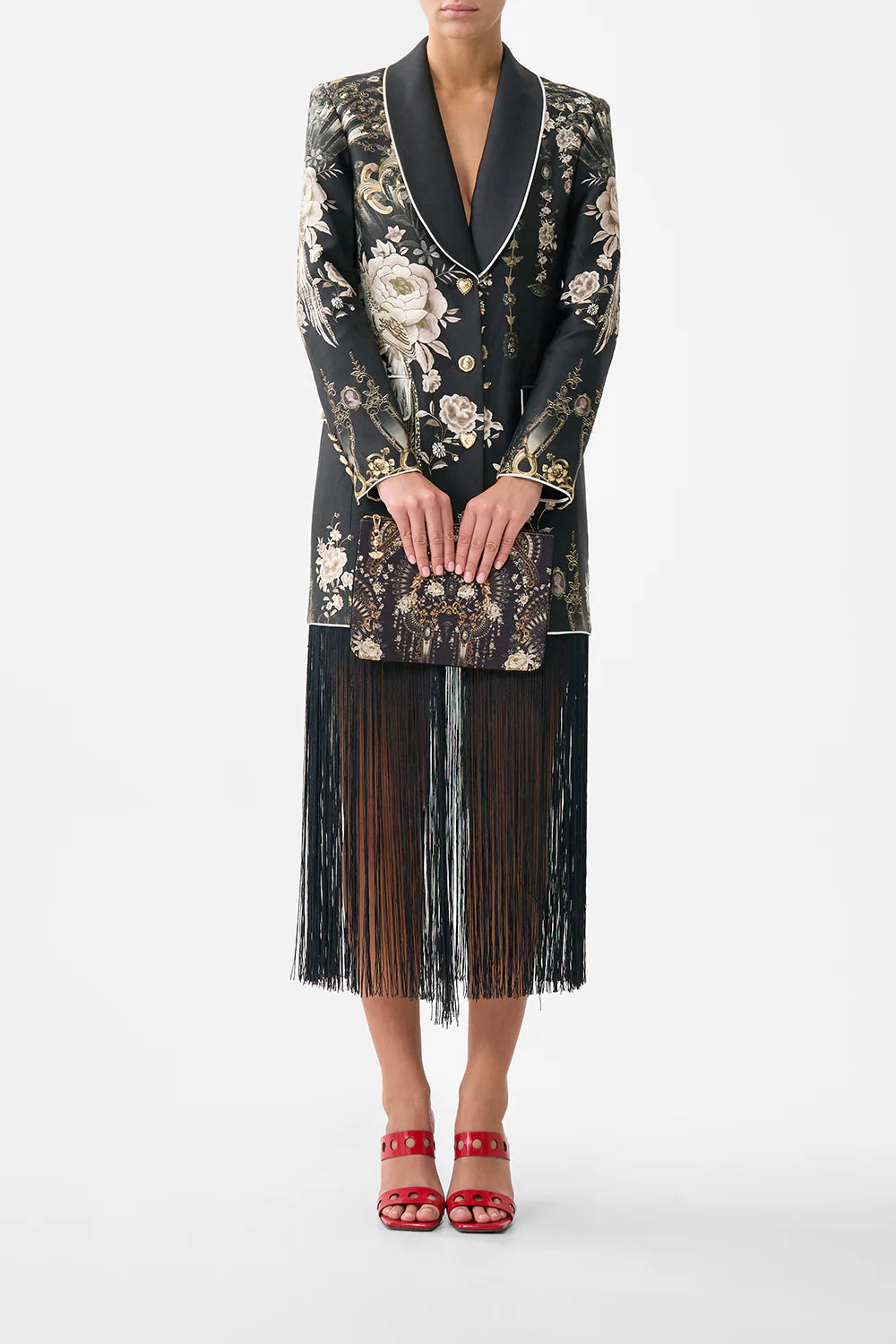 The Flamenco Folklore Small Canvas Clutch is a handcrafted accessory designed by our in-house artisans. Imagined in an exclusive limited edition print, our signature canvas clutch features contrast piped edges, meticulously placed crystal embellishments, a zip top enclosure and a custom made parrot clip. Internal pocket and generous main compartment keep treasures stored in style.
